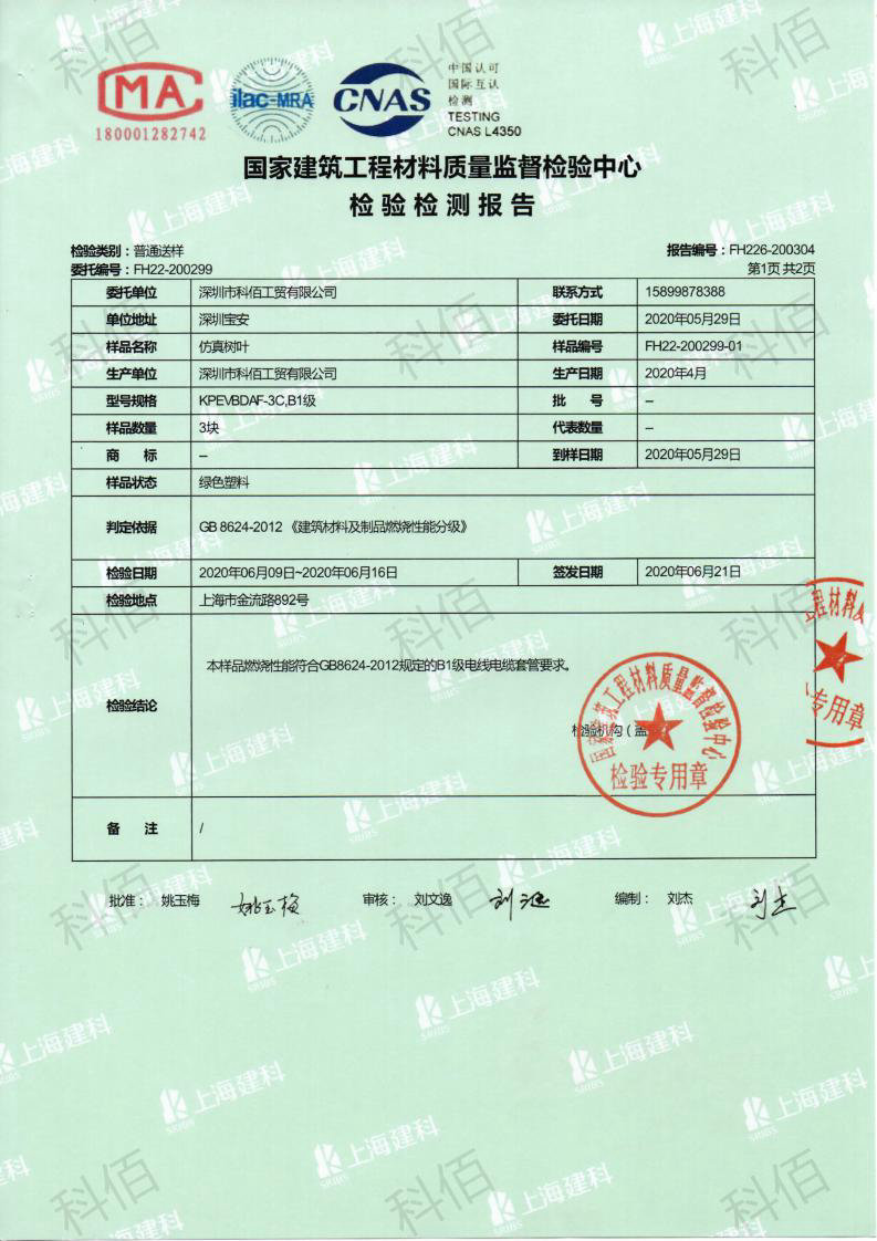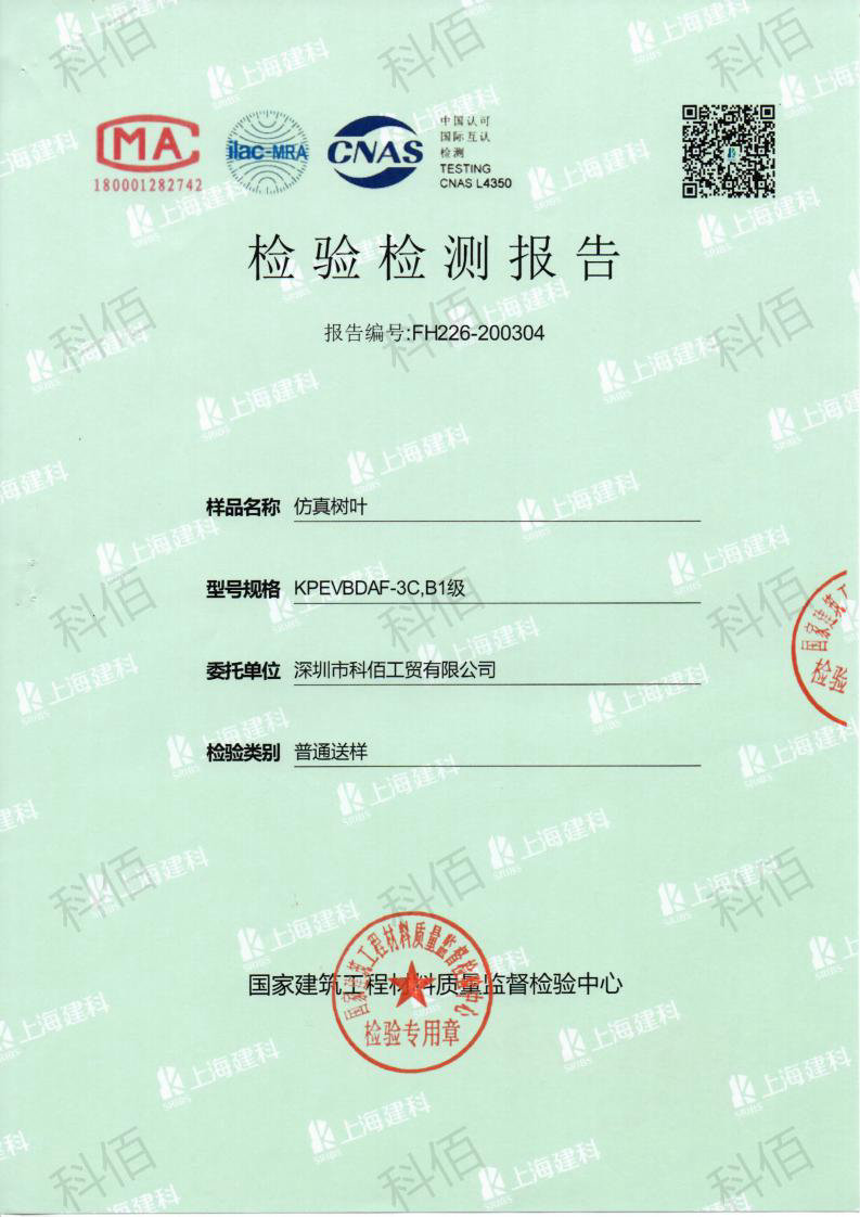 2020年6月份科佰再一次成功通過國家建筑工程材料質量監(jiān)督檢測對仿真樹葉產品進行防火燃燒性能檢測,檢測科佰仿真樹葉產品的質量過硬,達到了B1級的防火阻燃要求。此次仿真樹葉檢測燃燒性能是指材料燃燒或遇火時所發(fā)生的一切物理和化學變化,不同材料的防火性能決定了改材料的防火等級,科佰研發(fā)實驗室開展對各類防火產品的抽查檢驗,委托第三方檢測對科佰產品進行防火燃燒性能檢測,對各類送檢材料進行嚴格的防火性能測試、防火等級檢測,可出具權威資質認證、國家認可的檢測報告和分析報告。