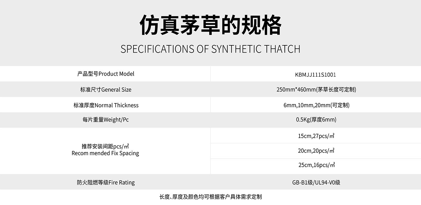 ? ? ? ? 合成茅草是深圳市科佰工貿(mào)有限公司采用目前國際上先進(jìn)的納米合成高分子材料技術(shù)和工藝生產(chǎn)。利用納米粒子的特有的物理化學(xué)性質(zhì),使得其具有更加優(yōu)異的耐候性及阻燃性,能滿足美國ASTM-G154-06 抗UV老化測試標(biāo)準(zhǔn),并能通過美標(biāo)UL94-V0級阻燃,在國內(nèi)仿真茅草也通過了國家防火建材阻燃測試B1級。?