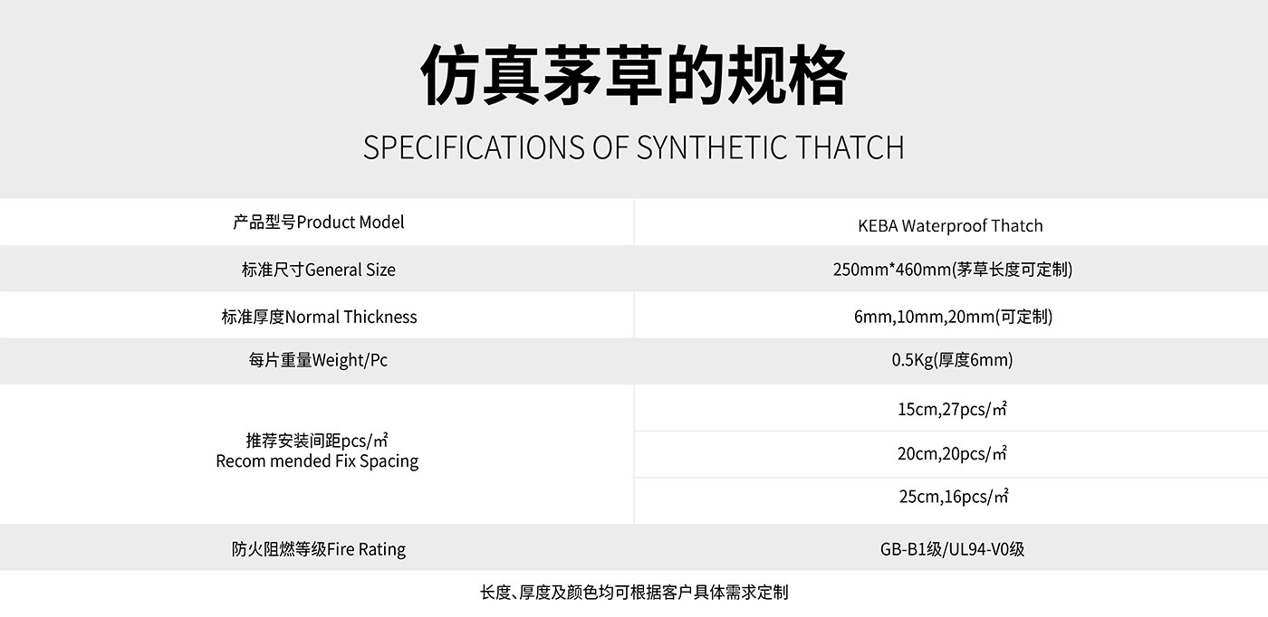 ? ? ? ? 防水仿真茅草是深圳市科佰工貿(mào)有限公司采用目前國(guó)際上先進(jìn)的納米合成高分子材料技術(shù)和工藝生產(chǎn)。利用納米粒子的特有的物理化學(xué)性質(zhì),使得其具有更加優(yōu)異的耐候性及阻燃性,能滿足美國(guó)ASTM-G154-06 抗UV老化測(cè)試標(biāo)準(zhǔn),并能通過(guò)美標(biāo)UL94-V0級(jí)阻燃,在國(guó)內(nèi)仿真茅草也通過(guò)了國(guó)家防火建材阻燃測(cè)試B1級(jí)。?
